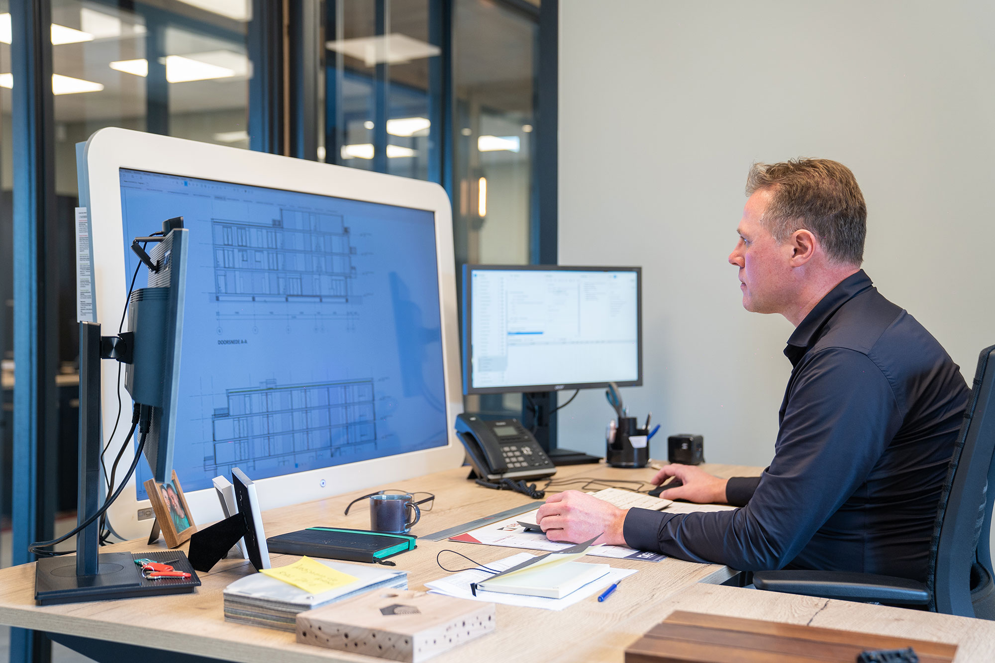 Wij combineren parametrisch ontwerpen met datagestuurde productieprocessen. Onze software zet het ontwerp om in een gedetailleerd 2D-model. Met behulp van intelligente software modelleren we elk onderdeel tot op de millimeter nauwkeurig. Denk aan sparingen, maar ook de benodigde bouwfysische en constructieve eigenschappen, bevestigingspunten en installatieruimte. Dit zorgt voor een perfecte aansluiting en montage op de bouwplaats.